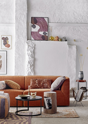 Foto: BloomingvilleČerný odkládací stolek Frei, pruhovaný puf Walder, dekorační polštář Barri ve tvaru válce, sada svíček Dip Dye, tmavá keramická váza Hyma s dekorem, vše od značky Bloomingville
