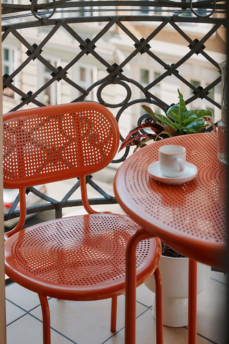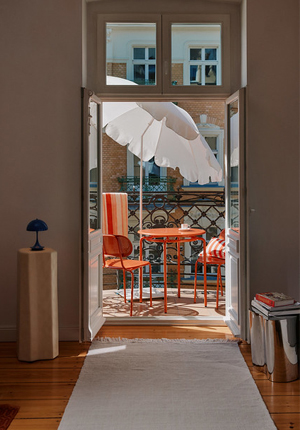Druhý balkon představuje sestavu Kumi v teplejším, energičtějším odstínu oranžové, která zve k veselým setkáním a odpolednímu odpočinku. Intenzivní barva nábytku přitahuje pozornost a dodává prostoru dynamiku. Vzorované polštáře a textilie oživují aranžmá, zatímco květináče s bujnou zelení přinášejí přírodní akcent.