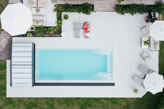 Jakmile byl bazén na místě, mohly začít práce na pokládce keramické dlažby. Práce prováděl obkladač z regionu.Visutá podlaha má jen minimální nároky na údržbu, velmi dobře větrá, navíc ve vzniklém prostoru pod ní lze vést nejrůznější rozvody. Je zajištěný snadný odtok stříkající nebo dešťové vody. Konstrukci je možné v případě potřeby opravit nebo zcela rozebrat. Práce byly dokončeny v druhé polovině roku 2023. A přestože první bazénové pozdní léto bylo deštivé, rodina si už naplno užívá nového bazénu. Jeanette Hammarstedtová je spokojená: "Na začátku září jsme mohli využít vzácné příležitosti a vyzvednout si děti dříve domů. Společně jsme si šli zaplavat a naplno si užívali krásného počasí. Bylo to prostě nádherné!"