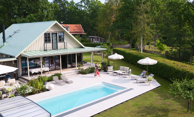 Po několika letech strávených ve švédském hlavním městě Stockholmu se interiérová designérka Jeanette Hammarstedtová s rodinou přestěhovala na venkov do rodného klidného Västerviku. Nyní žije s manželem Joelem a dětmi Sigvardem a Florou v domě, který během posledních osmi let proměnili zevnitř i zvenčí. Nejnovějším přírůstkem je bazén a terasa u domu, které byly dokončeny vloni v létě. Český specialista na keramické obklady dodal pro tento projekt venkovní dlaždice ze série Quarzit Outdoor, které dokonale ladí s kvalitním designem rodinné terasy, bazénu a rozlehlé zahrady.