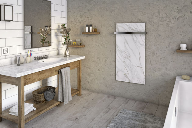 Topný infra panel Ecosun Calacatta (Fenix), slinutá keramika, lišta na zavěšení ručníku, cena 13 763 Kč, www.fenixgroup.cz