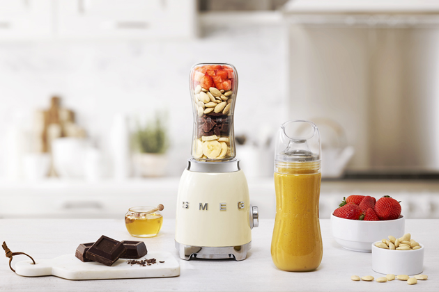 Smoothie maker 50’s Retro Style (Smeg), 600ml nádoba s nepropustným víkem a cestovní láhev, cena 3 299 Kč, www.pottenpanenn.cz