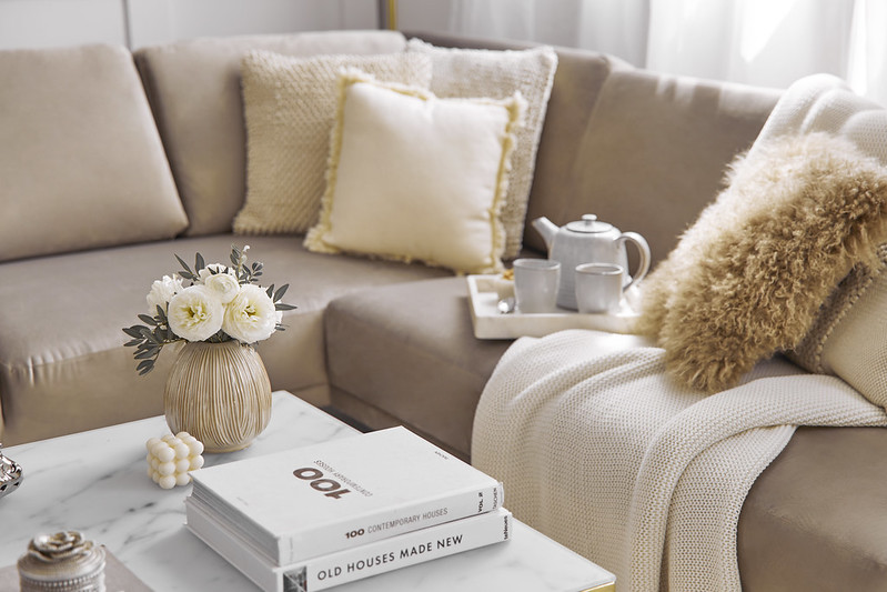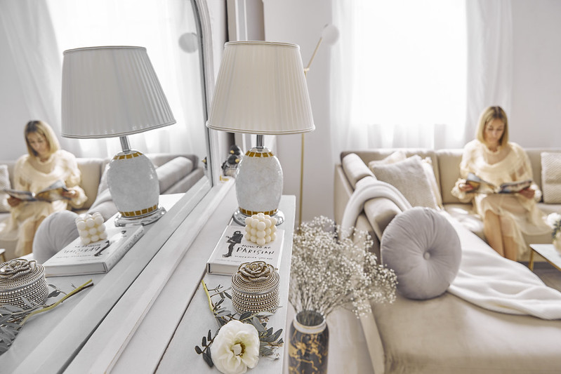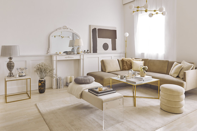 Béžová je určena pro nábytek - prošívané vanilkové pohovky a krémová křesla z lesklého veluru. Šedá je vidět na jejich mramorových detailech. Černá a bílá se objevují v grafických doplňcích, jako jsou plakáty, staré fotografie nebo vzorované textilie.