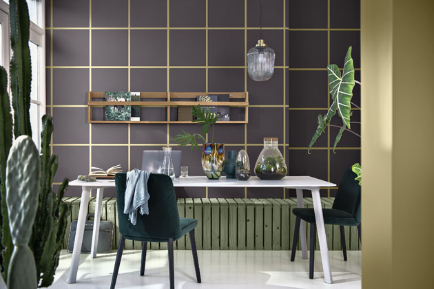 Máte chuť experimentovat? Zkuste na stěnu namalovat šachovnici pomocí Dulux barev, nalepovacích pásek a vodováhy. Šachovnicovým efektem dodáte prostoru šmrnc a nevšední atmosféru. Na fotce barva roku 2023, Obilný klas, www.dulux.cz