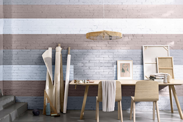 Pro kreativní prostor jsou ideální jemné odstíny barev. Osobitý dojem podtrhne i originální vytvoření pruhů. Ve spojení s blankytně modrou vykouzlí paleta vzdušných odstínů inspirativní pozadí pro libovolnou činnost, www.dulux.cz