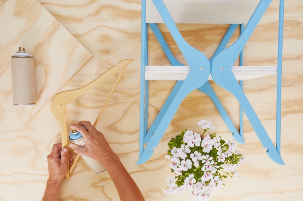 Následně desky stolu lehce obruste brusným papírem, abyste odstranily hrubé hrany. Ramínka a desky nastříkejte libovolnou barvou ve spreji. Tip: lehkým obroušením i dalších částí desek a ramínek pomůže barvě lépe přilnout.