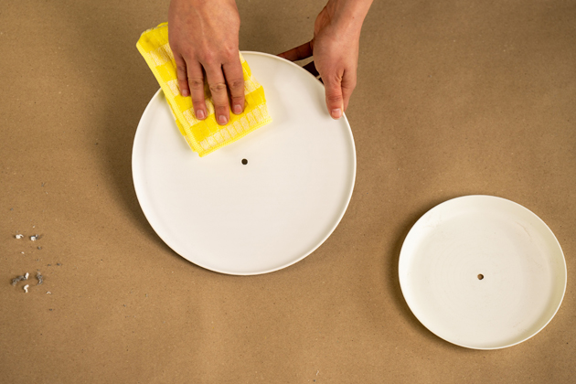 Připravte si plastové talíře a do středu každého z nich vyvrtejte díru. Tu pak pomocí brusné houby začistěte a zbylý povrch jemně zdrsněte, aby na něj barva lépe přilnula. Poté talíře vlhkým hadříkem otřete od prachu, mastnoty a dalších nečistot.
