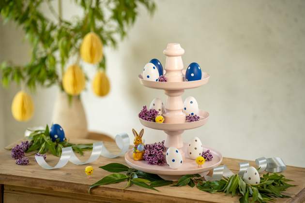 Na etažér naaranžujte velikonoční pečivo či sladkosti pro koledníky. Anebo vytvořte svou vlastní kompozici – na jednotlivá patra vyskládejte pestré kraslice, květiny (hyacint, petrklíč apod.), mladé větvičky, velikonoční zajíčky a další symboly probouzející se přírody. Vznikne vám tak jedinečná dekorace, která se stane hvězdou vaší jarní výzdoby.