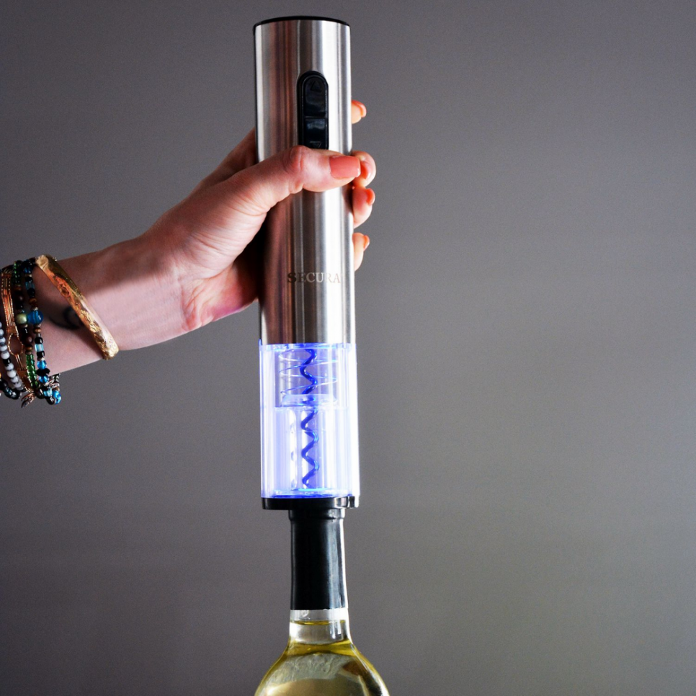 Princip fungování: Elektrický otvírák má tvar uzavřeného válce, v jehož spodní části se nachází šroubovice. Tu přiložíte k zátce, stisknete tlačítko pro zavrtání kovové spirály i pro vytáhnutí zátky – a máte hotovo. Nejmodernější kousky mají podsvícení a vy tak můžete sledovat, co se při otevírání vína děje s korkem nebo jinou zátkou. Elektrický otvírák může navíc měřit teplotu okolí i vína, abyste ho servírovali vždy za správných podmínek. Díky akumulátorovému provedení vás nikde nebude obtěžovat žádný kabel a indikátor vám včas prozradí, že je otvírák třeba dobít ve stanici.