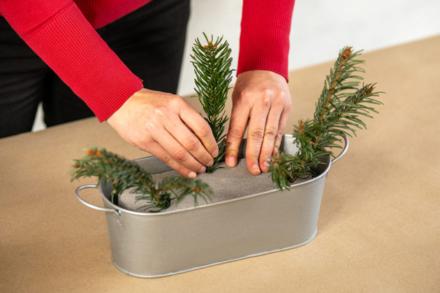Jakmile poslední vrstva nátěru zaschne, můžete svou pozornost přesunout k samotnému dekorování. Aranžovací hmotu seřízněte do požadované velikosti a vložte ji do truhlíku tak, aby vyplnila celý jeho prostor. Následně do hmoty zapíchejte připravené přírodniny. Skvěle budou vypadat jak různé druhy jehličnatých větví (např. smrkové, cedrové, borovicové, jedlové), tak například větvičky borůvčí. Aranžovací hmotu pomohou dokonale zakrýt mechy nebo lišejníky.