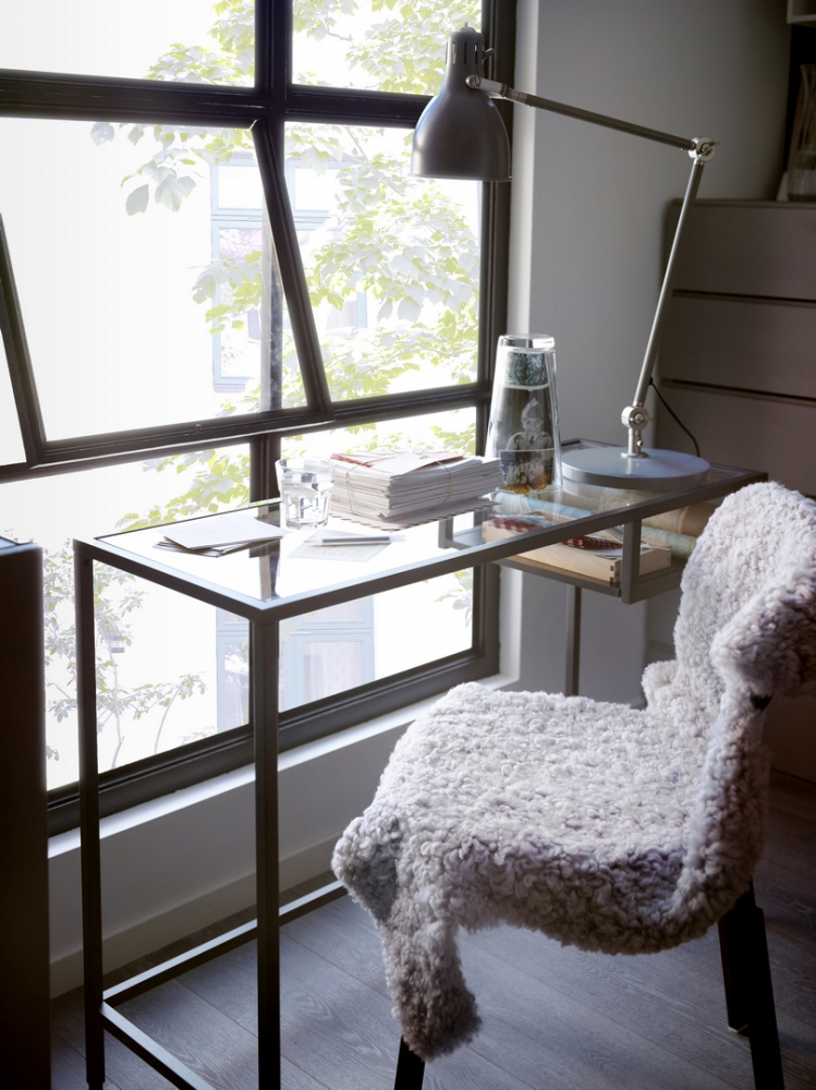 Stůl se židlí umístěte v blízkosti okna, do světlejší části místnosti. Sluneční svit je nejpřirozenějším zdrojem osvětlení a během slunečných dnů nebudete potřebovat lampu. Sluneční svit má také pozitivní vliv na lidskou psychiku a vyhnete se tak pocitům stísněnosti z tmavých koutů.