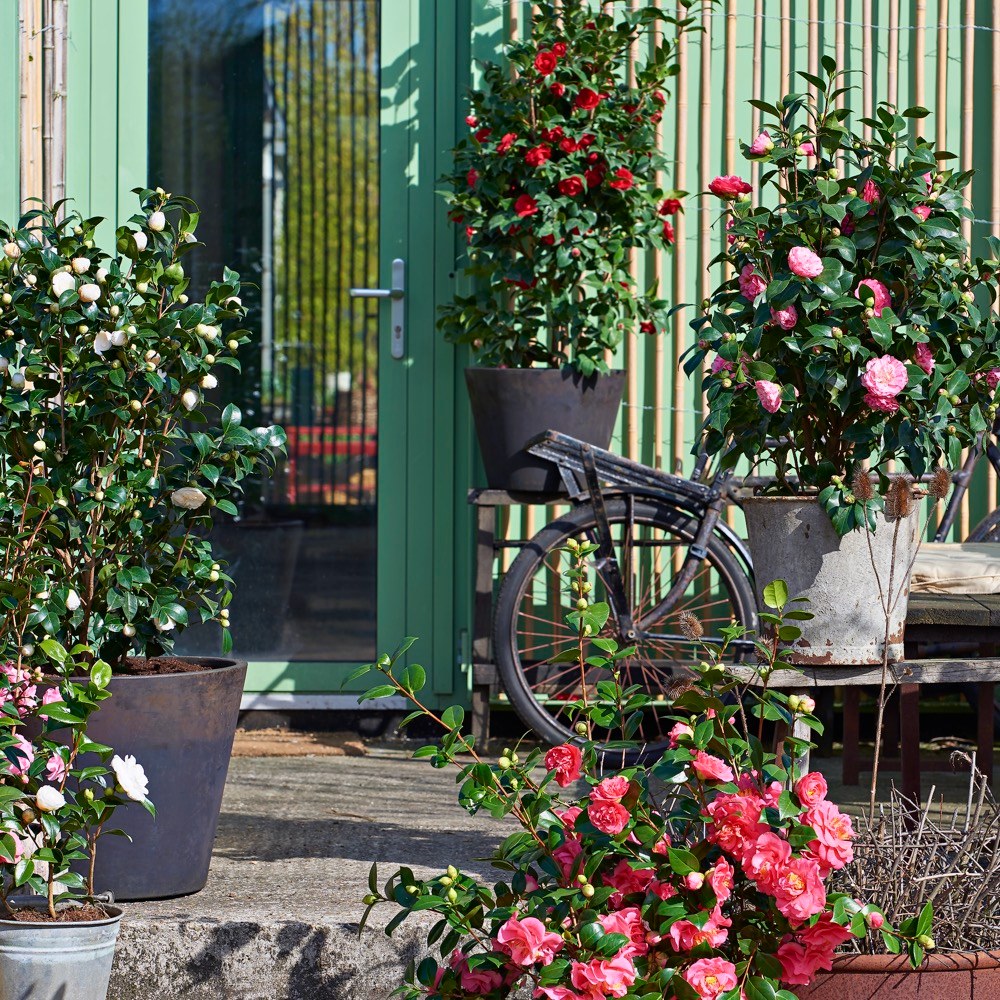 Nádherné květy této stálezelené rostliny připomínající čajové růže krásně kontrastují s lesklými sytě zelenými neopadavými listy. Existuje na dva tisíce kultivarů kamélií od jednokvětých přes sasankovité až po plné pivoňkovité dosahující úctyhodných průměrů. Preferují mírně kyselou půdu a chráněné místo v polostínu. U rostlin v květináči pozor na dehydrataci a opadání pupenů, což může mít za následek, že rostlina nebude kvést. Kvetení však nezastaví ani zima, ani sníh. Kamélie je mrazuvzdorná, ale dlouhé nebo silné mrazy by ji mohli poškodit. Rostlinu není potřeba zastřihovat, ale na jaře a začátkem léta jí dopřejte hnojivo. Dobře se kombinuje s dalšími rostlinami milujícími kyselejší půdu jako například s jehličnany.