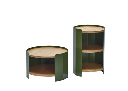 Polyfunkční odkládací stolky Gon z ohýbané oceli a masivního dubového dřeva nabízejí i částečně skrytý úložný prostor