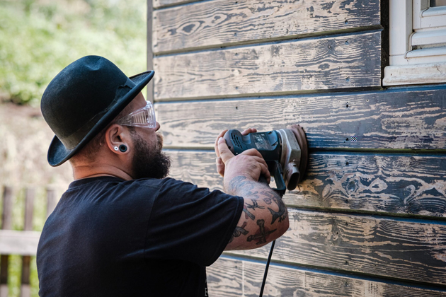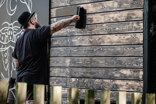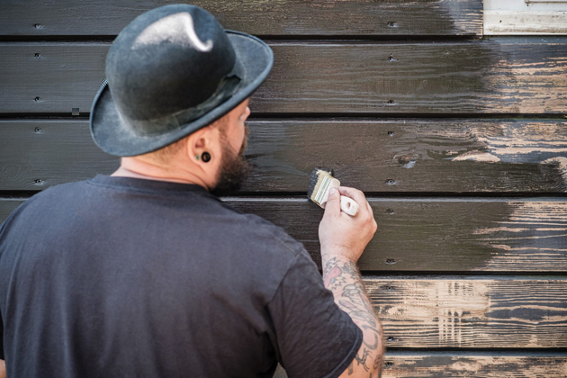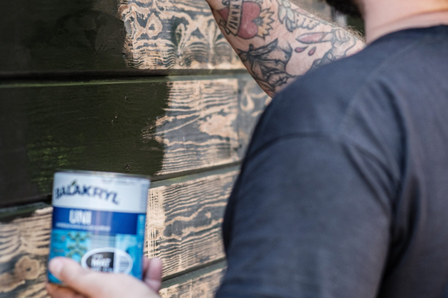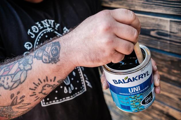 V dalším kroku bylo potřeba natřít dřevěnou fasádu maringotky. Majitel nejprve odstranil starý nátěr pomocí elektrické brusky. Na hůře dostupná místa použil brusnou houbu. Dále dřevo natřel univerzální krycí barvou Balakryl UNI, která je určena k vnitřním i venkovním nátěrům. „Barvu je potřeba před aplikací důkladně promíchat. Nanesl jsem ji ve 2 vrstvách s odstupem asi 2 hodiny. Skvěle kryje a dobře se s ní pracuje,“ dodává Tomáš Milon.
