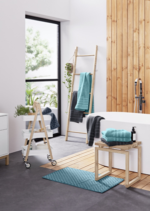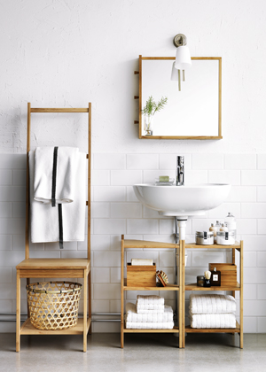 Koupelnový nábytek z řady Rågrund (Ikea), bambus, věšák na ručníky a židle, cena 1 690 Kč, police, cena od 890 Kč, www.ikea.cz