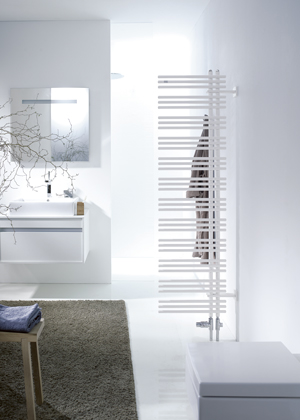 Koupelnový radiátor Yuka Assym (Zehnder), bílý lak, 1 304 × 478 mm, typ pro teplovodní i kombinované využití, cena 32 681 Kč, www.zehnder.cz