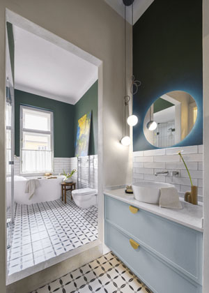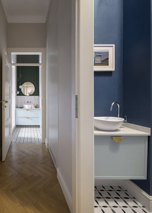 Světle modrá na koupelnovém nábytku se podle lomu světla proměňuje až do šedozeleného odstínu. Tato barva je podle designérky prvkem, který propojuje dva póly mezi zelenou a tmavě modrou. Zlatá barva, použitá na svítidlech, úchytkách, bateriích a rámech obrazů, zjemňuje celý interiér a zároveň tam vnáší požadovanou prvorepublikovou atmosféru.
