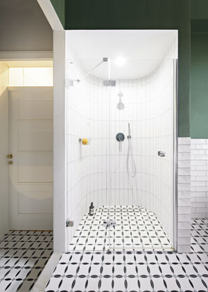 Při rekonstrukci koupelny přispěla majitelka vápencovým kamenem, který sehnala v kamenickém antiku. Kámen se použil jako stupínek mezi dvěma úrovněmi podlahy v koupelně. Tyto dvě úrovně si vyžádala instalace odpadů a vody. Aby krásný design bytu nerušily žádné technické prvky, jako je třeba bojler a kotel, designérka všechno rafinovaně schovala za neviditelná dvířka či do skříně s posuvnými dveřmi s výpletem.