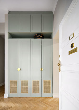 „Když jsem se s majitelkou poprvé setkala, přišla elegantní dáma v kožené sukni ozdobené saténovou mašlí. Hned jsem věděla, že měkké křivky vytvořené mašlí by mohly být nosnou linkou celého interiéru. Přišlo mi, že k této ženě to prostě patří,“ říká na úvod designérka. Zásadním prvkem udávajícím směr zařizování a vycházejícím z majitelčina přání byla sbírka obrazů, jež bylo potřeba do interiéru zakomponovat. Paní domu rovněž navrhla, do které místnosti by chtěla konkrétní obrazy dát. Při hledání stylu vycházela designérka z majitelčiny lásky k prvorepublikovému a zároveň i anglickému designu. Oba tyto designy bylo potřeba do bytu zahrnout a samozřejmě je nějak citlivě sladit. Praktickým požadavkem bylo umístění kuchyně do blízkosti obývacího pokoje. Inspiraci hledala designérka i v geometrii. Tu poskytlo půlkruhové okénko ve spíži.