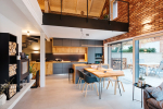 Hlavní obytnou místnost tvoří kuchyňský kout s vestavěnými skříněmi a do krovu otevřený obývací pokoj. „Dominantním prvkem této místnosti je štítová zeď, na přání majitele obložená mělkými cihlovými pásky. Tento vnitřní prostor jsme nechali hodně vyniknout kvůli použité nadkrokevní tepelné izolaci. To znamená, že podbití z palubek a kompletně celý krov, včetně krokoví a vzpěr je přiznané v bílém nátěru Osmo. Vše ladí s velkoformátovou keramickou dlažbou na podlaze v cementovém dekoru,“ popisuje architekt.