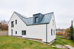 Investor se rozhodl vybrat tmavě šedý odstín krytiny SATJAM Rapid, o jejíž pokládku se postarala firma SBS Group s.r.o. „Obecně falcované krytiny patří mezi ty oblíbenější, ale mají nevýhodu poměrně pracné montáže. Nicméně existuje i jejich alternativa, jejíž pokládka může být výrazně jednodušší a i rychlejší. A tou je právě zvolená minimalistická plechová střešní krytina SATJAM Rapid, kterou pohledově od té pracovně falcované krytiny na místě montáže vůbec nerozeznáte,“ doplňuje Ing. Petr Tureček, produktový manažer společnosti SATJAM, předního českého výrobce plechových střech. Celkový moderní vzhled stavby podtrhuje kompozice vikýřů a dřevohliníkových oken od Novia okna, s.r.o.