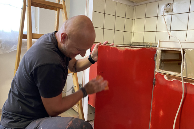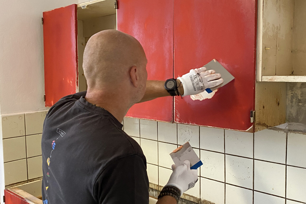 Dříve než se pustíte do renovace kuchyňské linky, vykliďte ze skříněk veškeré nádobí. Z polic setřete prach. Kuchyňská dvířka vysaďte z pantů, aby se vám s nimi lépe pracovalo. Pokud jsou z dřevotřísky potažené fólií, která se místy začala odlupovat, je potřeba ji strhnout. Pomocí elektrické brusky, smirkového papíru nebo brusné houby následně odstraňte původní nepřilnavé nátěry. Dvířka také důkladně omyjte mýdlovou a čistou vodou, aby na ně nová barva dobře přilnula a neoloupala se.