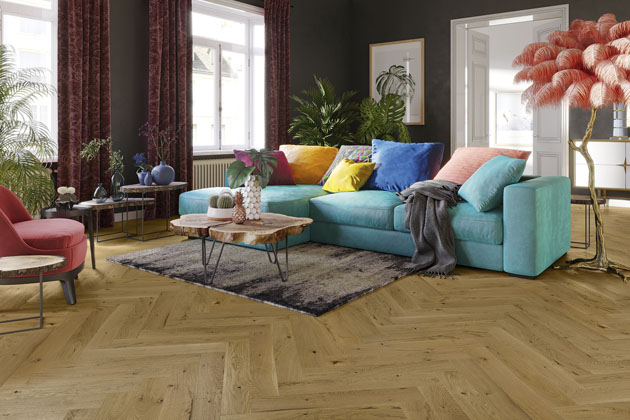 Třívrstvá dřevěná podlaha Pure Wood (Floor Forever), dub Fishbone Piano Rustik, 110 × 660 mm, cena 1 680 Kč/m2, www.floorforever.cz