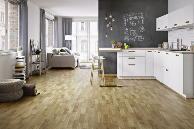 Parketový vzor má třívrstvá dřevěná podlaha Pure Wood, dub Hamburg, speciální lak, 207 × 2 200 mm, cena 1 078 Kč/m2, www.floorforever.cz