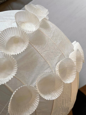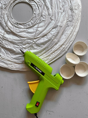 2. Postupně vždy na každý papírový košíček naneste kapku roztaveného lepidla a ihned jej přilepte k stínítku. Rozmístění košíčků si můžete předem vyznačit, nebo je lze lepit i nahodile.