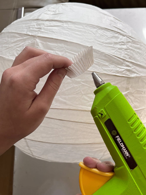 1. Složené stínítko rozviňte a zavěste na nějaké šikovné místo, kde bude pro lepení dobře dostupné. Do tavné pistole vložte tyčinku, zapněte pistoli do zásuvky a počkejte, než se nahřeje.
