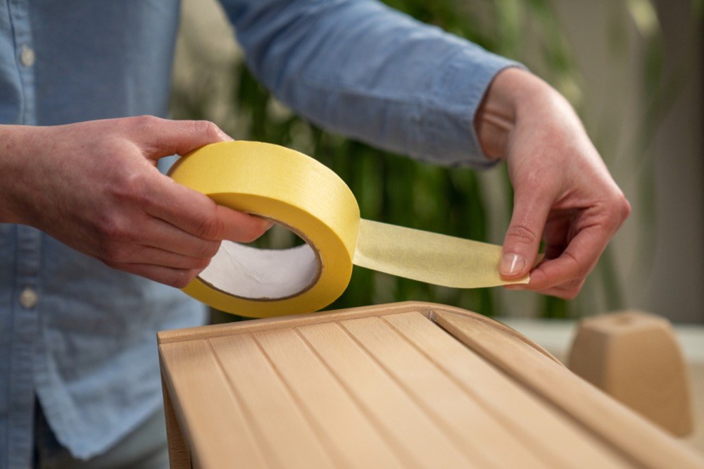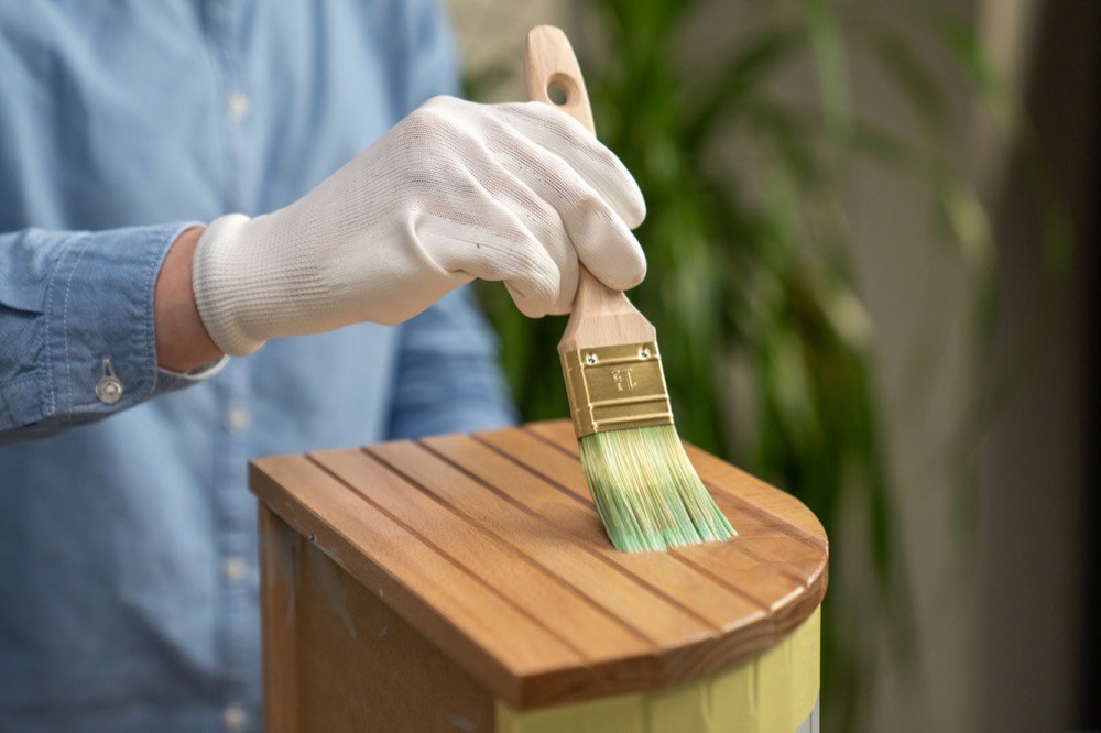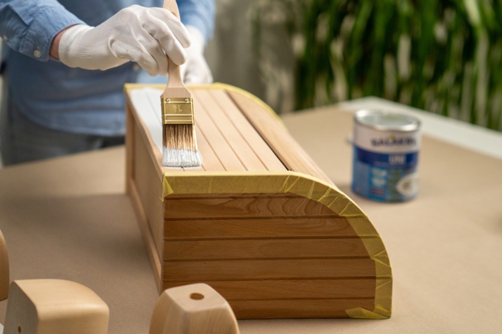 Během schnutí začněte s natíráním dřevěných nohou. Použít můžete jiný odstín nátěru Balakryl UNI, nebo tyto plochy nechat v odstínu dřeva. V tom případě doporučujeme zvolit bezbarvý akrylátový lak Balakryl Sportakryl, který přírodní vzhled dřeva krásně zvýrazní. Navíc vytvoří velmi odolný a omyvatelný povrch, který se snadno udržuje. Lak důkladně rozmíchejte a neředěný ho aplikujte ve dvou vrstvách s odstupem přibližně 2 hodiny. Poté odstraňte krycí pásku a natřete zbylé části nočního stolku – úchytky a odkládací plochu. Boky chlebníků a dřevěné úchytky předtím opět oblepte krycí páskou.