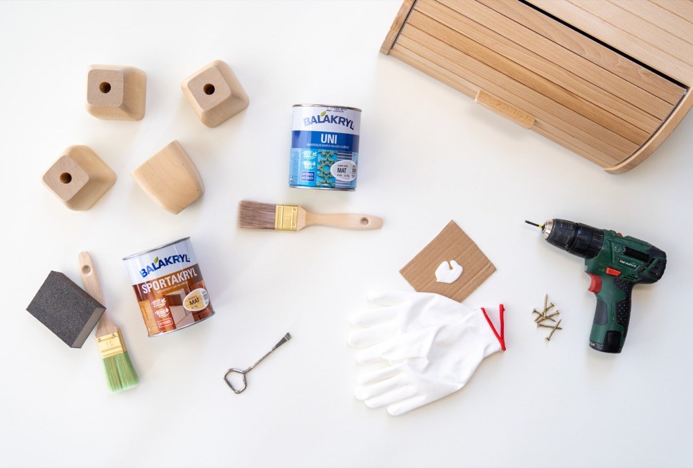 Pokud vám doma zrovna žádné chlebníky nepřebývají, můžete je zakoupit v obchodě s doplňky do domácnosti nebo na internetu. Dále budete potřebovat čtyři dřevěné nábytkové nohy (k dostání v obchodech s nábytkem), brusnou houbu, krycí pásku, pracovní rukavice, vruty, vrtačku, plochý štětec (vel. 1,5″), plochý malířský štětec, krycí barvu Balakryl UNI, lak Balakryl Sportakryl a lepidlo na dřevo.
