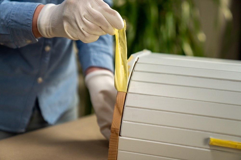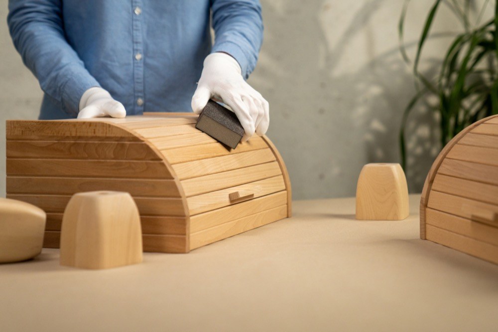 Dříve, než se pustíte do natírání, musí být povrch chlebníků suchý, čistý a odmaštěný. Dřevo lehce zdrsněte pomocí brusné houby. Boční strany a obě úchytky pak zakryjte maskovací páskou. Krycí barvu Balakryl UNI důkladně promíchejte a přední stranu chlebníku včetně dvířek natřete pomocí plochého štětce. My jsme zvolili světle šedý odstín. První vrstvu nechte zaschnout přibližně 2 hodiny, poté ji lehce zbruste a aplikujte druhou vrstvu nátěru.
