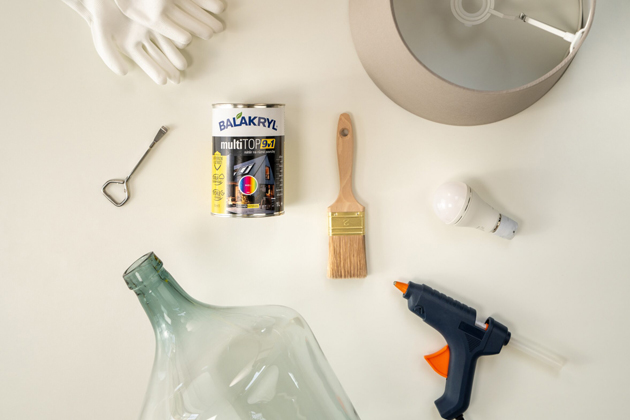 Máte ve sklepě zapomenutý skleněný demižon, který už dávno neslouží k výrobě moštů či domácích likérů? Proměňte ho v designovou stolní lampu, která se stane ozdobou každého obývacího pokoje i ložnice. My jsme použili nádobu o objemu 10 litrů, ale můžete zvolit i větší. Dále budete potřebovat tavnou pistoli, plochý štětec (vel. 2″), pracovní rukavice, multifunkční akrylátovou barvu Balakryl MultiTOP 9v1, stínidlo na lampu (k dostání v obchodech s bytovými doplňky) a LED žárovku