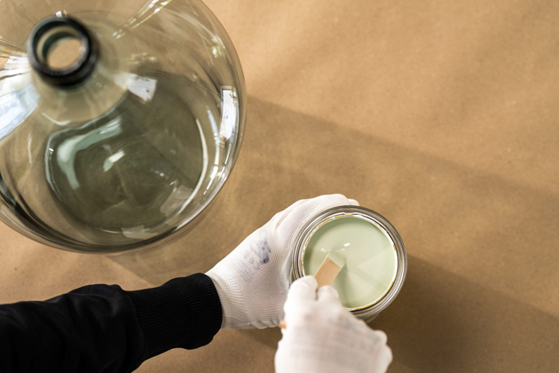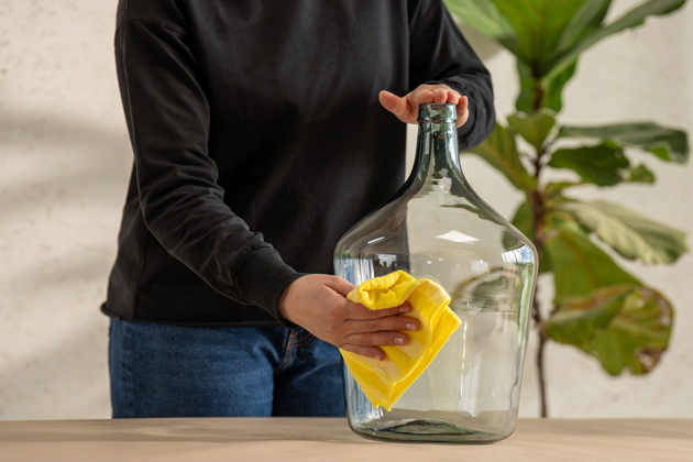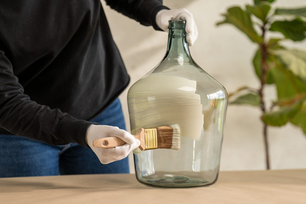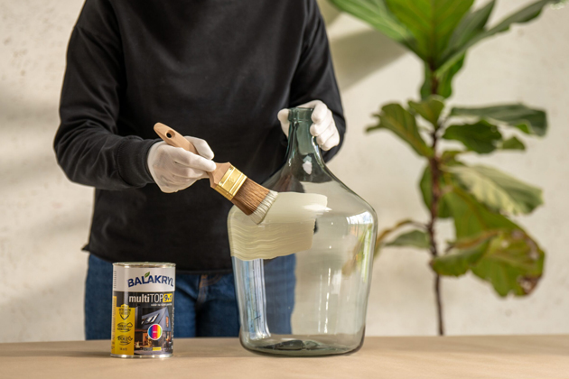 Demižon otřete vlhkým hadříkem od prachu a nečistot. Před natíráním povrch musí být také zbavený mastnoty. Nátěr Balakryl MultiTOP 9v1 důkladně rozmíchejte a nanášejte neředěný plochým štětcem. Tato akrylátová barva na vodní bázi je vhodná na různé druhy povrchů. Rychle schne a vytváří odolný, pružný a hedvábně matný povrch s dlouhou životností. Navíc ji lze tónovat až do 20 000 odstínů (my jsme sáhli po uklidňujícím zelenkavém Ocean of calm PPG1129-2). První nátěr nechte zaschnout cca 4 hodiny, pak aplikujte druhou vrstvu.