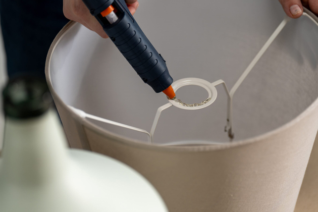 Jakmile obě vrstvy nátěru zaschnou, připravte si tavnou pistoli, stínidlo a žárovku. Na kovový rám stínidla naneste lepidlo a ihned jej nasaďte na hrdlo demižonu. Po zaschnutí lepidla už stačí jen do středu nasadit dobíjecí žárovku.