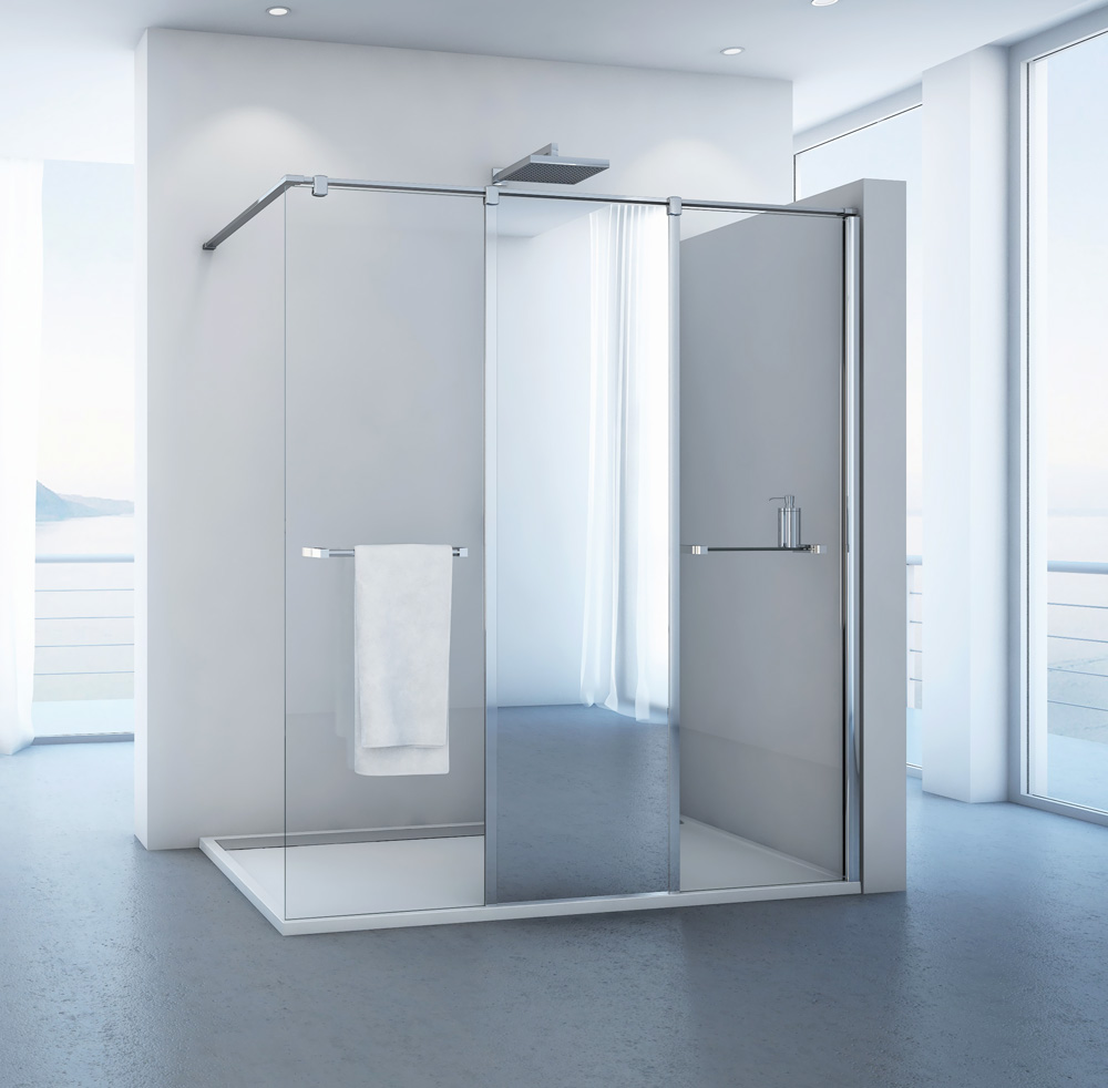 S plochou vaničkou či žlabem získáte čisté a bezbariérovou řešení. Za zástěnu si připlaťte a zvolte skleněnou, která je vždy z bezpečnostního cca 8mm skla. Úklid vám usnadní sklo s antiplakovou úpravou. V současné době jsou vyhledávané a velmi moder ní sprchové kouty typu walk-in, které nemají dveře, ale pouze zástěnu.