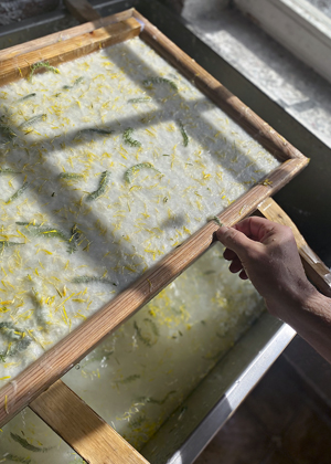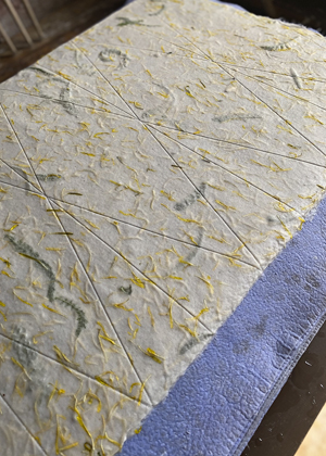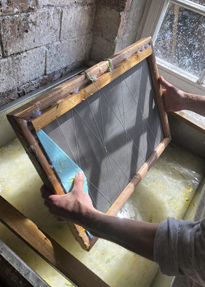 Pro výrobu ručního papíru používám 3D tištěná síta, která mají již vystouplé drážky určené pro vznik ohybu papíru. Tato technika umožňuje vytvořit papír s přesně definovanými ohyby, aniž by bylo nutné používat tradiční bigovací stroj, a otevírá nové možnosti využití ručního papíru, který je tak připravený ke skládání. V místě těchto drážek papír uschne v tenčí vrstvě a přesně v těchto místech se po vyschnutí papír ohýbá.