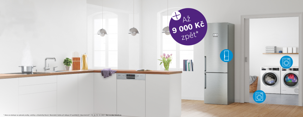 Pokud si do 15. prosince 2021 koupíte některý z vybraných spotřebičů Bosch (v akci jsou vybrané pračky, kombinované pračky se sušičkou, sušičky prádla a chladničky), můžete získat část peněz zpět. Podrobnější informace a podmínky najdete na registrační stránce akce-bosch.cz.
