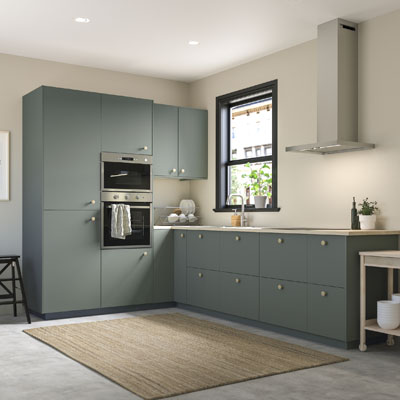 Foto: IkeaSestava Metod (Ikea), šedozelenou fóliovanou plochu oživují jemné bílé úchyty a černé vestavné spotřebiče, www.ikea.cz