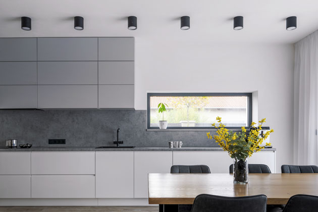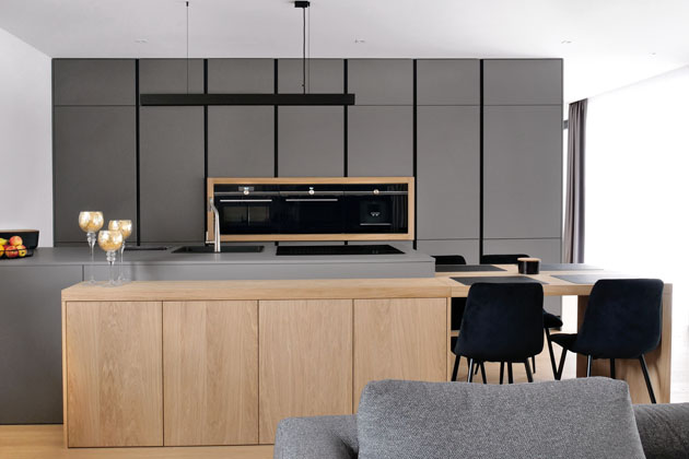 Výrazný trend do kuchyní přinesla černá barva a odstíny tmavě šedé. K možnosti jejich většího využití na velkých plochách přispěly technologie, které umožnily zhotovení sametově hladkých a velice odolných povrchů, jež na rozdíl od lesklých ploch působí měkce a teple. Stejně jako různé odstíny bílé ladí černá a tmavě šedá skvěle se všemi odstíny a dekory dřeva, s nimiž často zapůsobí až nečekaně útulně. Elegantní a efektní jsou také šedočerné kombinace.