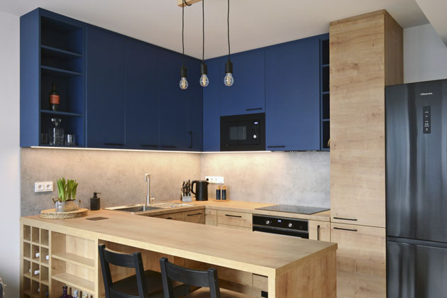Kuchyňská sestava (JN Interier) působí díky kombinaci dekoru světlého dřeva se sytě modře lakovanou horní skříňkou originálně, www.jninterier.cz