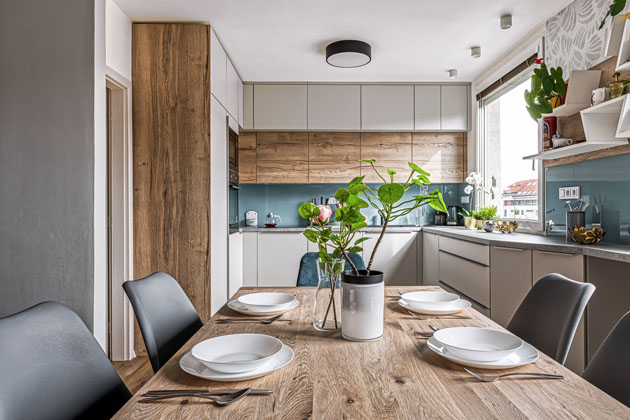 Kuchyňskou sestavu (JN Interier), s osvědčenou kombinací matné bílé s výrazným dekorem dubového dřeva oživuje lesklý modrozelený obklad stěny nad pracovní plochou, www.jninterier.cz