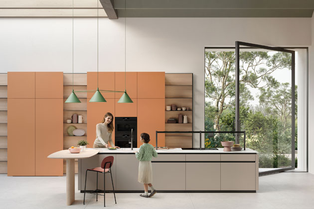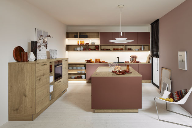 Sestava (Nolte) v decentní kombinaci sytého starorůžového odstínu a světlého dřeva s akcentem černého okenního rámu a žaluzie, www.nolte-kuechen.com