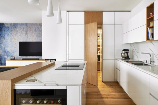 Kuchyň Elite (Hanák), bílý lesklý lak a světlá dubová dýha použitá na dveřích do spíže, polici a části ostrůvku, www.hanak-nabytek.cz