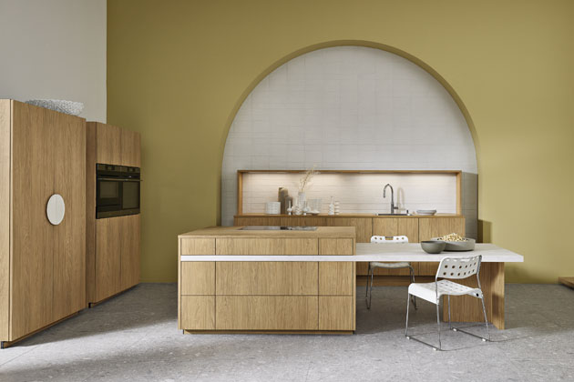 Sestavu (Nolte) s dekorem světlého dřeva ozvlášťňuje bílý pult zapuštěný do ostrůvku, www.nolte-kuechen.com