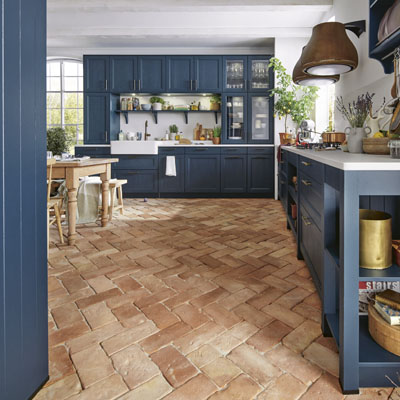 Foto: SchüllerKuchyň Finca (Schüller), venkovsky laděný styl podtrhuje výraznější barevné provedení tlumené bílými doplňky a cihlovou podlahou, www.schuller.de