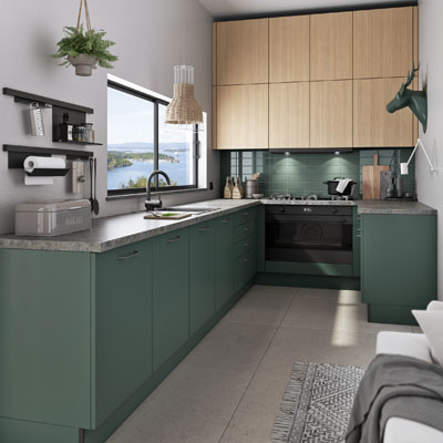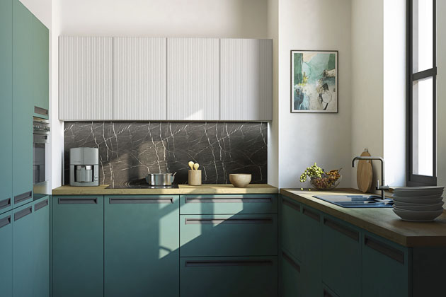 Jeden z trendů představují kuchyně v různých odstínech zelené. K oblibě této barvy přispěly její tlumené tóny, které pronikly do interiérů se zemitými odstíny dalších barev. Tmavší zelená barva přináší do kuchyní eleganci a útulnost. Přívětivě a teple ale působí například i světle mátové nebo šalvějové tóny, které dobře slouží jako neutrální základ pro výraznější doplňky. Kromě dřevěných prvků, které příjemně zateplí i ostřejší zelenou, tuto barvu skvěle oživí také černé doplňky.