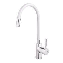 Foto: NovaservisDřezová stojánková baterie (Novaservis), bílá chrom s elastickým flexi ramenem,