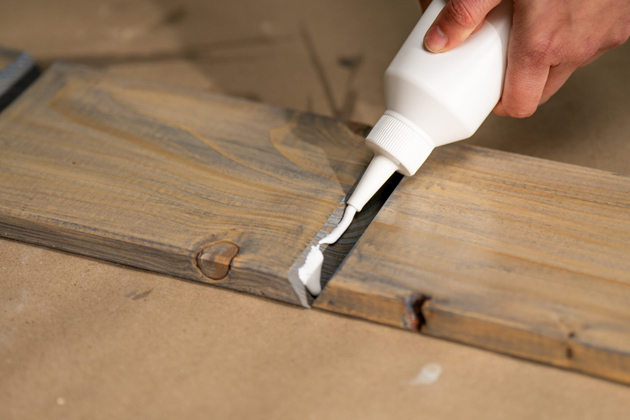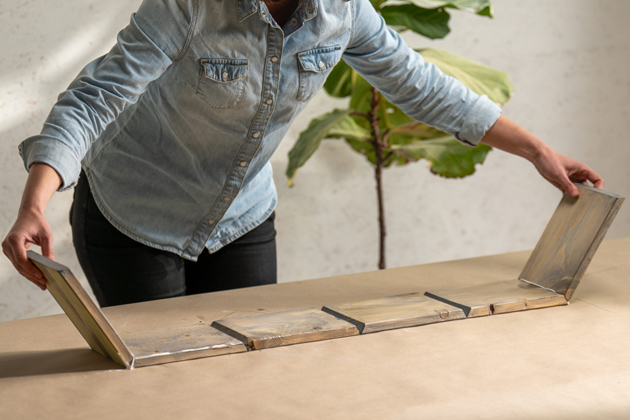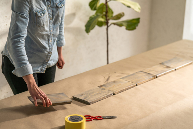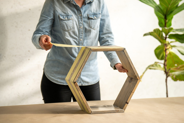 Po zaschnutí lazury položte všech šest prkének do řady za sebou, aby se kratší strany dotýkaly – zkosené hrany jsou otočeny dolů směrem k pracovní desce. Vzniklou řadu po celé délce spojte krycí páskou, ideálně ve dvou pruzích s menším přesahem. Pak opatrně otočte o 180° a do zkosených mezer mezi prkénky naneste lepidlo. Následuje velké finále: uchopte protilehlé konce, zvedněte je do výšky a spojte k sobě pomocí krycí pásky do hexagonu. Lepidlo nechte důkladně zaschnout, pak sloupněte krycí pásku.